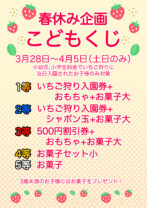 今年も春休みイベントを開催致します。 3月28日、29日、4月4日、5日の土日で開催。 いちご狩りへご入園された幼児、小学生様が対象になります。 3才未満のお子様にはお菓子をプレゼント。 一日必ず1等が入っておりますので […]